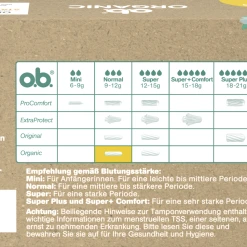 Die o.b.® Organic Normal Tampons für eine mittlere bis stärkere Periode sind vom Tampon selbst bis zum Rückholbändchen frei von Plastik, für einen zuverlässigen und natürlichen Schutz. Die o.b.® Organic Normal Tampons bestehen aus 100% zertifizierter Bio-Baumwolle und bieten mit ihren einzigartigen geschwungenen Rillen ein sauberes und geschütztes Gefühl. Darüber hinaus sind die Organic Tampons frei von schädlichen Chemikalien (z.B. Pestizide), Chlorbleiche und Parfüm. Zudem besteht die Verpackung zu 90% aus recycelten Materialien und der Karton ist zu 100% recycelbar. Außerdem sind sie zertifiziert von ECOCERT und produziert nach GOTS-Standard.