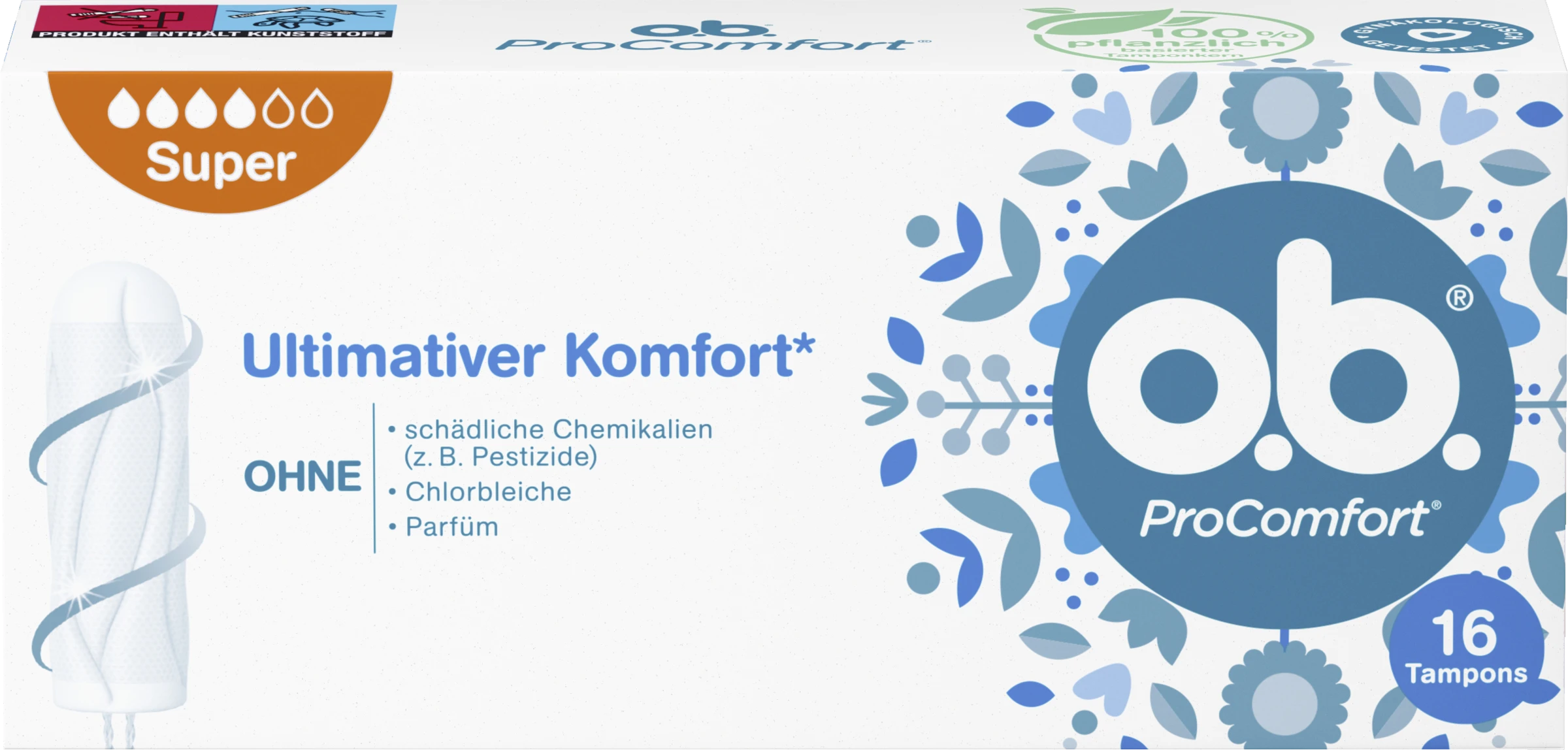 Die o.b.® ProComfort® Tampons mit Dynamic Fit™ Technologie und SilkTouch® Oberfläche sorgen für ultimativen Komfort* (*innerhalb des o.b.® Sortiments) und zuverlässigen Schutz: Die 3D Entfaltung sorgt für ein natürliches Anpassen des Tampons an den Körper und die einzigartigen und ineinander greifenden Rillen helfen die Flüssigkeit effizient im Inneren des Tampons zu verteilen. Die SilkTouch® Oberfläche sorgt für ein besonders sanftes Einführen und Entfernen. Zudem sind die o.b.® ProComfort® Tampons gynäkologisch getestet, enthalten einen 100% pflanzlich basierten Tamponkern und sind frei von schädlichen Chemikalien (z.B. Pestizide), Chlorbleiche und Parfüm.