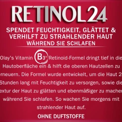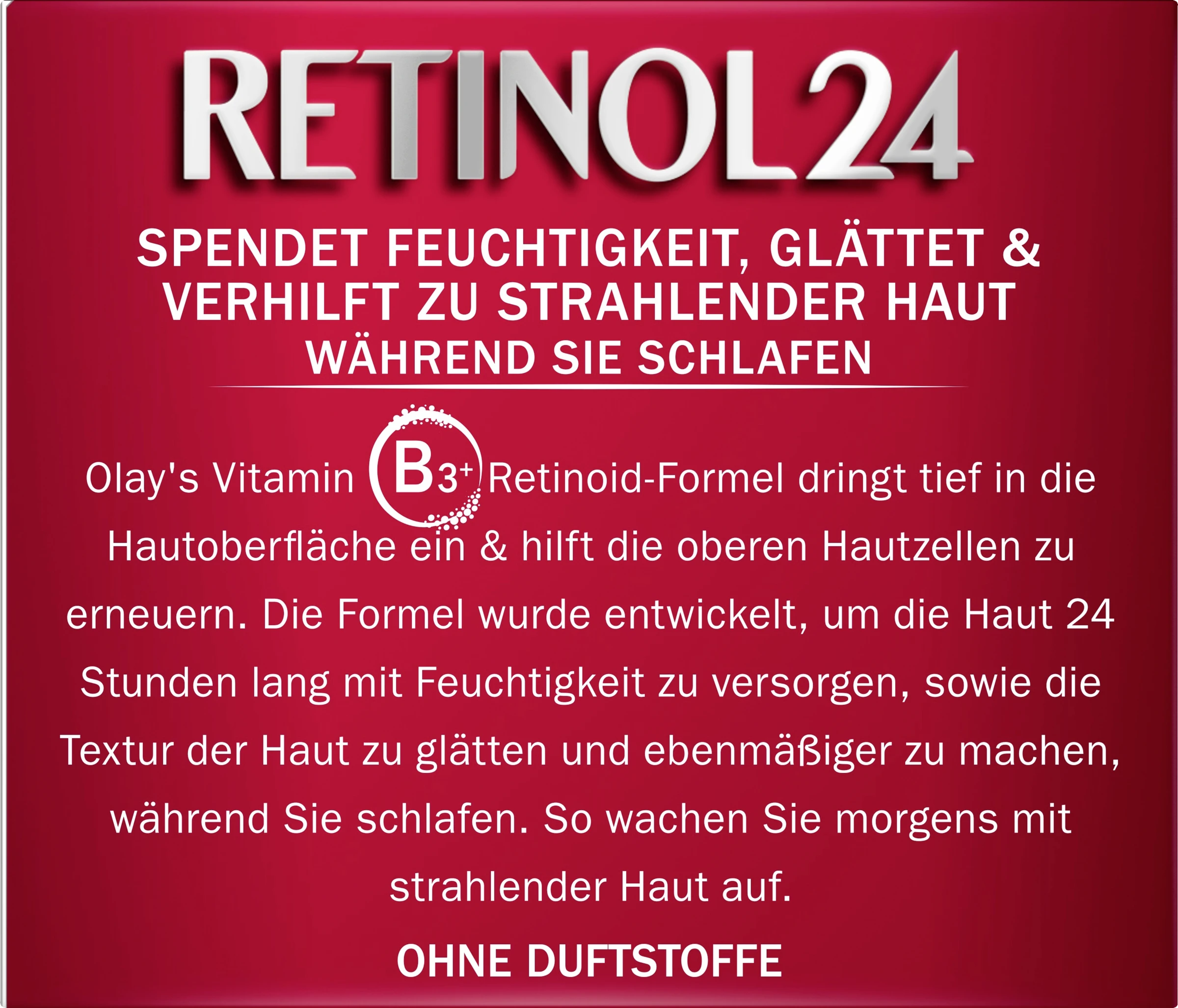 Die Olay Regenerist Retinol 24 Nachtcreme mit der patentierten Formel vereint Vitamin B3 mit einem Retinoid-Komplex. Sie versorgt die Haut 24 Stunden lang mit Feuchtigkeit und sorgt für sichtbare Verbesserungen von feinen Linien und Falten sowie dunklen Flecken und Poren. Sie glättet und strafft die Haut und bringt diese zum Strahlen. Die parfüm- und farbstofffreie Feuchtigkeitscreme zieht schnell ein und dringt tief in die obersten Hautschichten, sodass Sie jeden Morgen mit glatter, strahlender Haut aufwachen. Verwenden Sie Olay Retinol24 täglich 28 Tage lang und sehen Sie, wie sich Ihre Haut verwandelt. Die Nachtcreme ist für den täglichen Gebrauch geeignet.