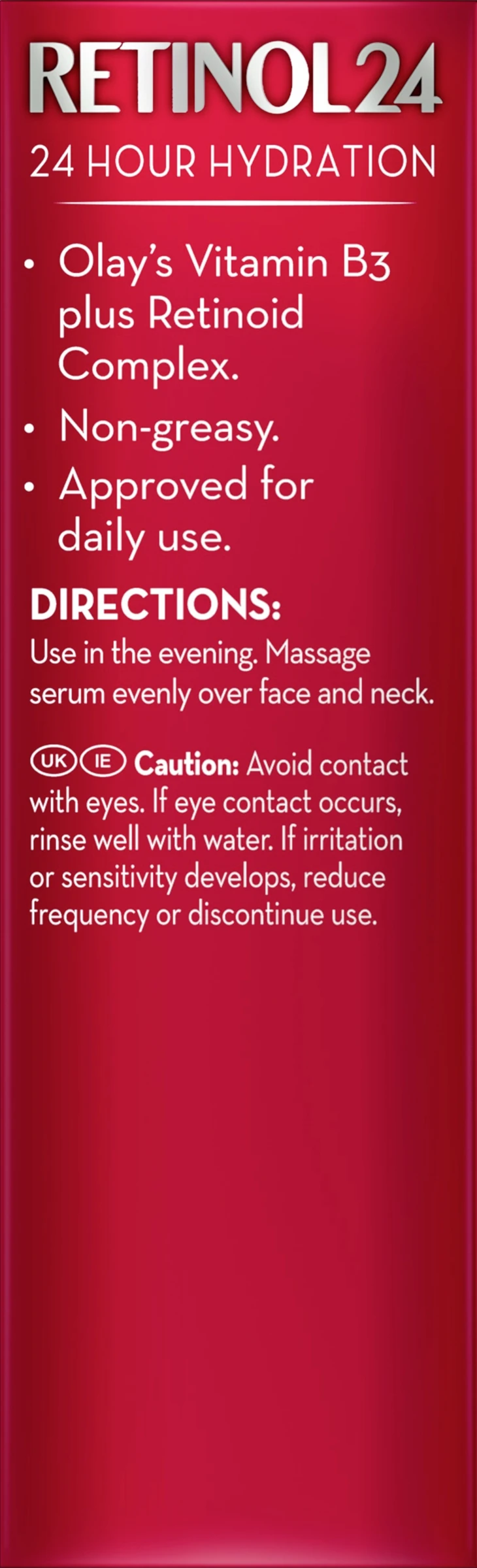 Das Olay Regenerist Retinol24 Nachtserum mit der patentierten Formel vereint Vitamin B3 mit einem Retinoid-Komplex. Es versorgt die Haut 24 Stunden lang mit Feuchtigkeit und sorgt für sichtbare Verbesserungen von feinen Linien und Falten sowie dunklen Flecken und Poren. Es glättet und strafft die Haut und bringt diese zum Strahlen. Das parfüm- und farbstofffreie Serum zieht schnell ein und dringt tief in die obersten Hautschichten ein, sodass Sie jeden Morgen mit glatter, strahlender Haut aufwachen. Verwenden Sie Olay Retinol24 täglich 28 Tage lang und sehen Sie, wie sich Ihre Haut verwandelt. Das Nachtserum ist für den täglichen Gebrauch geeignet.