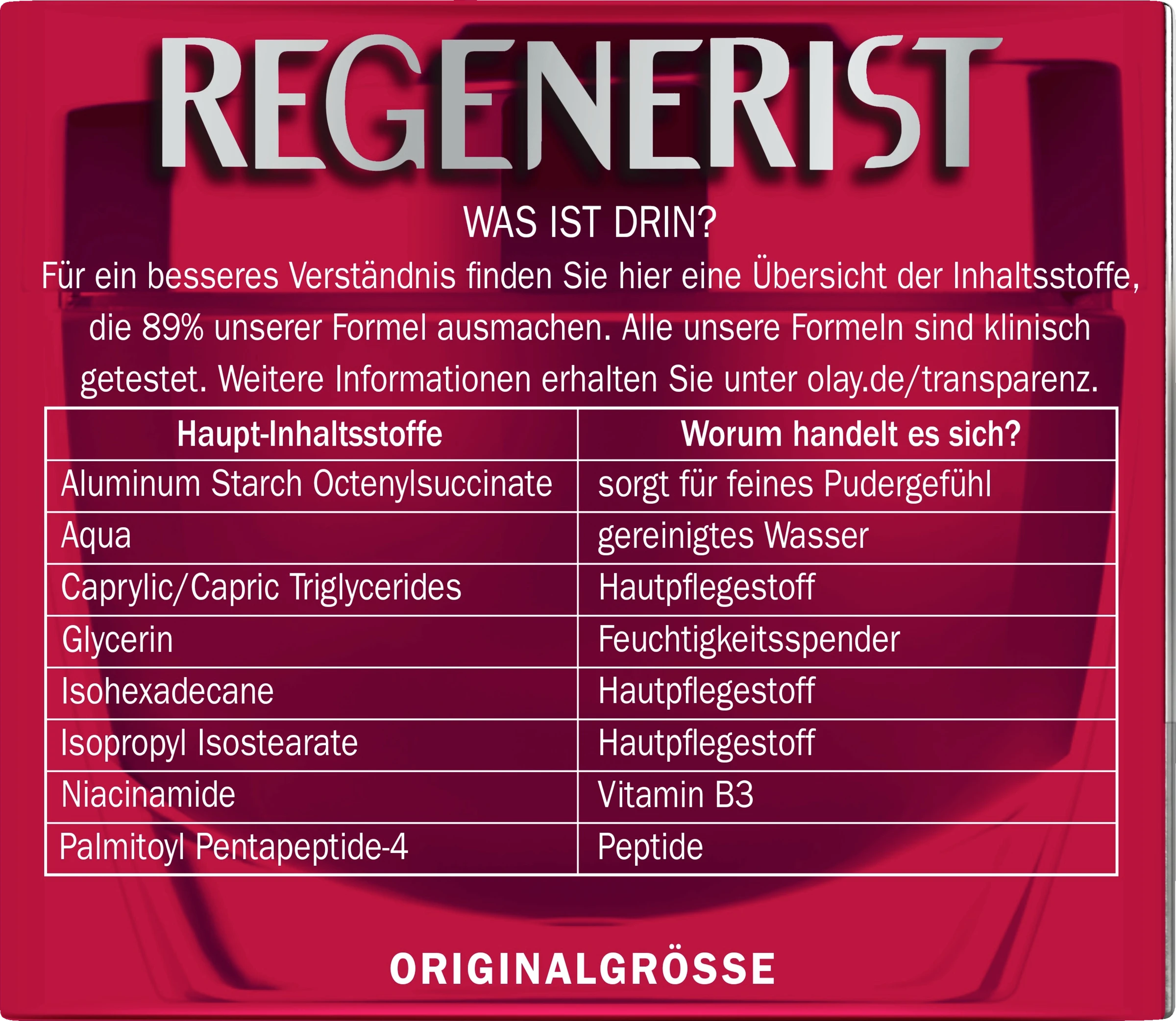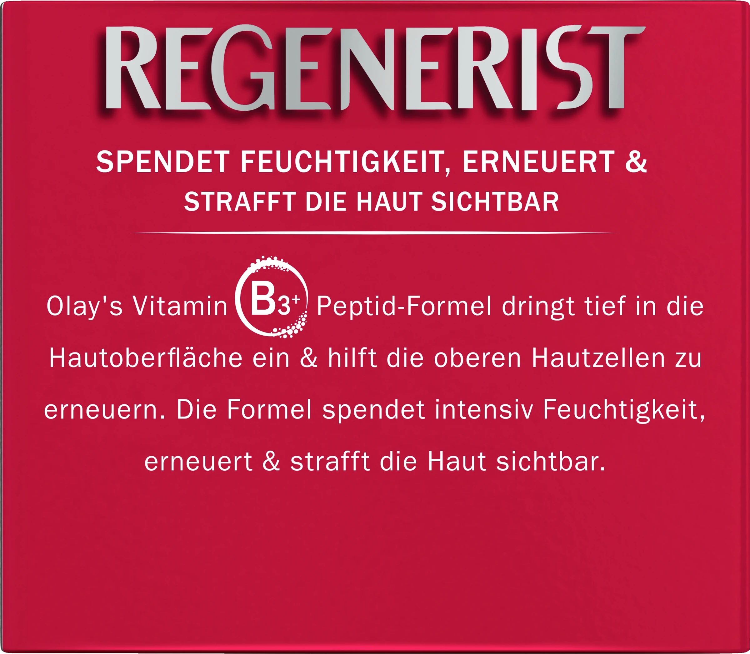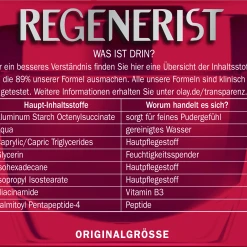Die Olay Regenerist Tagespflege ist mit Amino-Peptiden und Vitamin B3 angereichert und versorgt die Haut intensiv mit Feuchtigkeit für 24 Stunden. Die Formel bringt Wirkstoffe bis tief in die Hautoberfläche ein, strafft und erneuert sichtbar die oberen Hautzellen für ein verbessertes Erscheinungsbild. Die seidige Textur eignet sich besonders für trockene Haut bis Mischhaut. Verwenden Sie Olay Regenerist täglich 28 Tage lang und sehen Sie, wie sich Ihre Haut verwandelt.