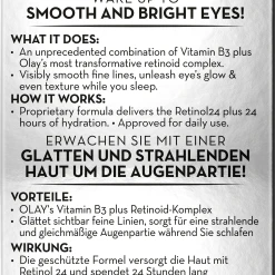 Die Olay Retinol24 Augencreme für die Nacht wurde speziell für die empfindliche Haut rund um die Augenpartie entwickelt. Sie glättet sichtbar feine Linien und sorgt für eine strahlende und gleichmäßige Augenpartie während Sie schlafen. Die Augencreme verleiht ein weiches und angenehmes Hautgefühl, zieht schnell ein und dringt tief in die Hautoberfläche ein, sodass Sie jeden Morgen mit einer jünger aussehenden, strahlenden Augenpartie aufwachen. Die patentierte Formel vereint Vitamin B3 mit einem Retinoid-Komplex. Für eine 24-Stunden-Feuchtigkeitsversorgung tragen Sie die Creme abends um die Augenpartie auf. Die Formel ist parfümfrei und frei von Farbstoffen. Verwenden Sie Olay Retinol24 täglich 28 Tage lang und sehen Sie, wie sich Ihre Haut verwandelt. Die Augencreme ist für den täglichen Gebrauch geeignet.