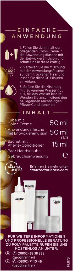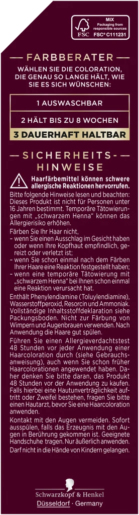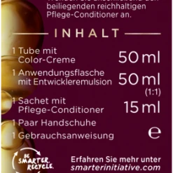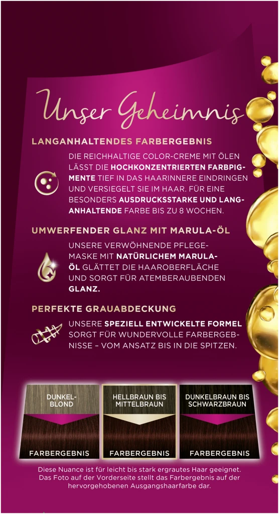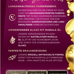 Die reichhaltige Color-Creme mit Ölen lässt die hochkonzentrierten Farbpigmente tief in das Haarinnere eindringen und versiegelt sie im Haar. Für eine besonders ausdrucksstarke und langanhaltende Farbe bis zu 8 Wochen. Unsere verwöhnende Pflegemaske mit natürlichem Marula-Öl glättet die Haaroberfläche uns sorgt für atemberaubenden Glanz. Unsere speziell entwickelte Formel sorgt für wundervolle Farbergebnisse – vom Ansatz bis in die Spitzen.