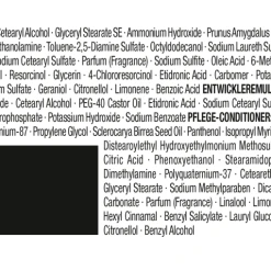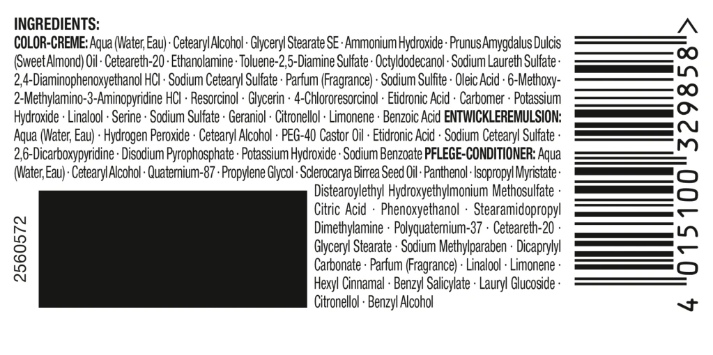 Haarfärbung/-tönung, oxidativ: Aqua, Cetearyl Alcohol, Glyceryl Stearate SE, Ammonium Hydroxide, Prunus Amygdalus Dulcis Oil, Ceteareth-20, Ethanolamine, Toluene-2,5-Diamine Sulfate, Octyldodecanol, Sodium Laureth Sulfate, 2,4-Diaminophenoxyethanol HCl, Sodium Cetearyl Sulfate, Parfum, Sodium Sulfite, Oleic Acid, 6-Methoxy-2-Methylamino-3-Aminopyridine HCl, Resorcinol, Glycerin, 4-Chlororesorcinol, Etidronic Acid, Carbomer, Potassium Hydroxide, Linalool, Serine, Sodium Sulfate, Geraniol, Citronellol, Limonene, Benzoic Acid | Pflegespülung, rinse off: Aqua, Cetearyl Alcohol, Quaternium-87, Propylene Glycol, Isopropyl Myristate, Distearoylethyl Hydroxyethylmonium Methosulfate, Citric Acid, Phenoxyethanol, Stearamidopropyl Dimethylamine, Polyquaternium-37, Ceteareth-20, Glyceryl Stearate, Sodium Methylparaben, Dicaprylyl Carbonate, Sclerocarya Birrea Seed Oil, Parfum, Linalool, Limonene, Hexyl Cinnamal, Benzyl Salicylate, Lauryl Glucoside, Citronellol, Panthenol, Benzyl Alcohol | Entwickler: Aqua, Hydrogen Peroxide, Cetearyl Alcohol, PEG-40 Castor Oil, Etidronic Acid, Sodium Cetearyl Sulfate, Disodium Pyrophosphate, 2,6-Dicarboxypyridine, Potassium Hydroxide, Sodium Benzoate.