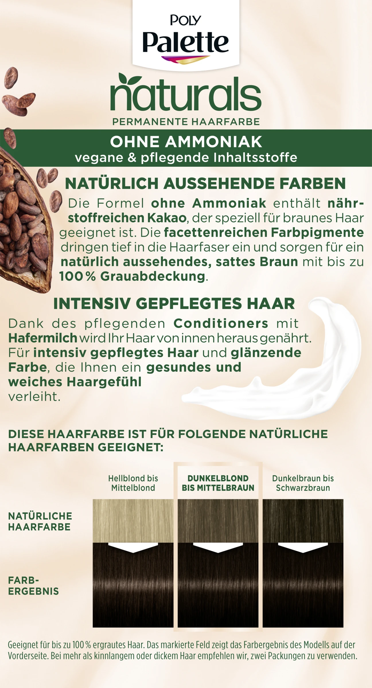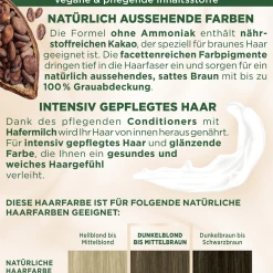 PALETTE – deine beste Wahl in Sachen Farbe! NatĂĽrlich aussehende & langanhaltende Farben fĂĽr starkes & gepflegtes Haar. Die Formel ohne Ammoniak enthält nährstoffreichen Kakao, der speziell fĂĽr braunes Haar geeignet ist. Die facettenreichen Farbpigmente dringen tief in die Haarfaser ein und sorgen fĂĽr ein natĂĽrlich aussehendes, sattes Braun mit bis zu 100% Grauabdeckung. Intensiv gepflegtes Haar Dank des pflegenden Conditioners mit Hafermilch wird Ihr Haar von innen heraus genährt. FĂĽr intensiv gepflegtes Haar und glänzende Farbe, die Ihnen ein gesundes und weiches HaargefĂĽhl verleiht. Unser Versprechen Gemeinsam schaffen wir schöne Momente fĂĽr eine bunte und nachhaltige Welt.