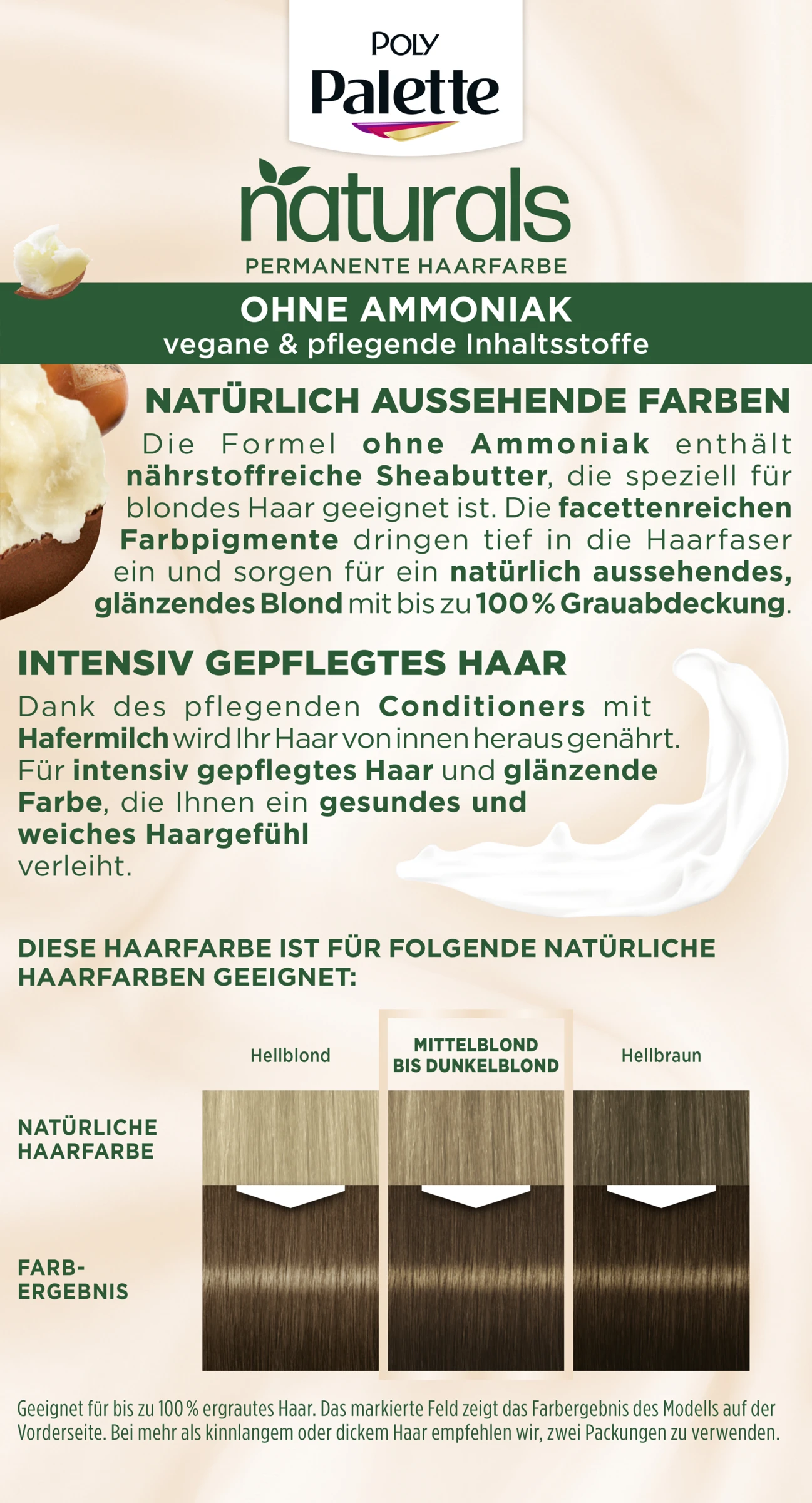 PALETTE – deine beste Wahl in Sachen Farbe! NatĂĽrlich aussehende & langanhaltende Farben fĂĽr starkes & gepflegtes Haar. Die Formel ohne Ammoniak enthält nährstoffreiche Shea Butter, die speziell fĂĽr blondes Haar geeignet ist. Die facettenreichen Farbpigmente dringen tief in die Haarfaser ein und sorgen fĂĽr ein natĂĽrlich aussehendes, glänzendes Blond mit bis zu 100% Grauabdeckung. Intensiv gepflegtes Haar Dank des pflegenden Conditioners mit Hafermilch wird Ihr Haar von innen heraus genährt. FĂĽr intensiv gepflegtes Haar und glänzende Farbe, die Ihnen ein gesundes und weiches HaargefĂĽhl verleiht. Unser Versprechen Gemeinsam schaffen wir schöne Momente fĂĽr eine bunte und nachhaltige Welt.