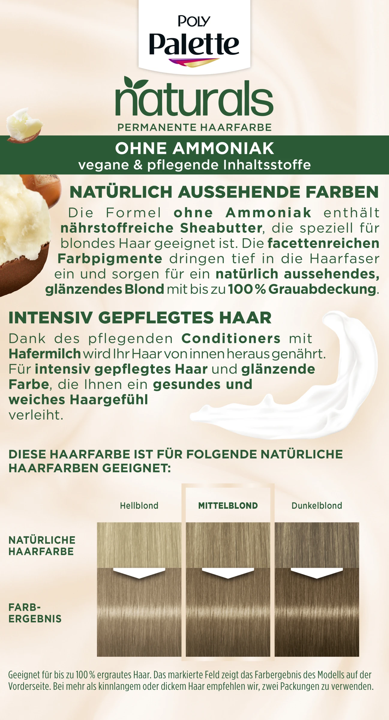 PALETTE – deine beste Wahl in Sachen Farbe! NatĂĽrlich aussehende & langanhaltende Farben fĂĽr starkes & gepflegtes Haar. Die Formel ohne Ammoniak enthält nährstoffreiche Shea Butter, die speziell fĂĽr blondes Haar geeignet ist. Die facettenreichen Farbpigmente dringen tief in die Haarfaser ein und sorgen fĂĽr ein natĂĽrlich aussehendes, glänzendes Blond mit bis zu 100% Grauabdeckung. Intensiv gepflegtes Haar Dank des pflegenden Conditioners mit Hafermilch wird Ihr Haar von innen heraus genährt. FĂĽr intensiv gepflegtes Haar und glänzende Farbe, die Ihnen ein gesundes und weiches HaargefĂĽhl verleiht. Unser Versprechen Gemeinsam schaffen wir schöne Momente fĂĽr eine bunte und nachhaltige Welt.