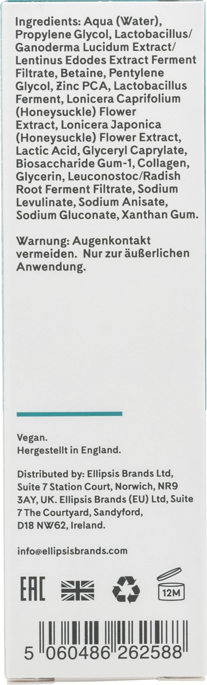 Aqua (Water), Propylene Glycol, Lactobacillus/ Ganoderma Lucidum Extract/ Lentinus Edodes Extract Ferment Filtrate, Betaine, Pentylene Glycol, Zinc PCA, Lactobacillus Ferment, Lonicera Caprifolium (Honeysuckle) Extract, Lonicera Japonica (Japanese Honeysuckle) Extract, Lactic Acid, Glyceryl Caprylate, Biosaccharide Gum-1, Collagen, Glycerin, Leuconostoc/ Radish Root Ferment Filtrate, Sodium Levulinate, Sodium Anisate, Sodium Gluconate, Xanthan Gum.