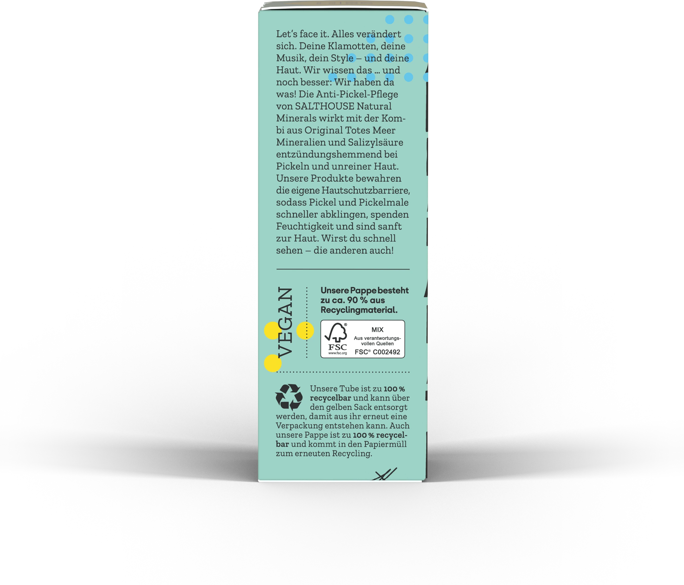 Let’s face it. Alles verändert sich. Deine Klamotten, deine Musik, dein Style und deine Haut. Wir wissen das … und noch besser: Wir haben da was! Die Anti-Pickel-Pflege von Salthouse Natural Minerals wirkt mit der Kombi aus Original Totes Meer Mineralien und Salizylsäure entzündungshemmend bei Pickeln und unreiner Haut. Die Produkte bewahren die eigene Hautschutzbarriere, sodass Pickel und Pickelmale schneller abklingen, spenden Feuchtigkeit und sind sanft zur Haut. Wirst du schnell sehen, die anderen auch!
