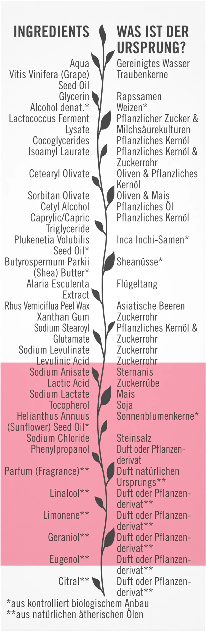 Aqua (Water), Vitis Vinifera (Grape) Seed Oil, Glycerin, Alcohol denat.*, Lactococcus, Ferment Lysate, Cocoglycerides, Isoamyl Laurate, Cetearyl Olivate, Sorbitan Olivate, Cetyl Alcohol, Caprylic/Capric Triglyceride, Plukenetia Volubilis Seed Oil*, Butyrospermum Parkii (Shea) Butter*, Alaria Esculenta Extract, Rhus Verniciflua Peel Wax, Xanthan Gum, Sodium Stearoyl Glutamate, Sodium Levulinate, Levulinic Acid, Sodium Anisate, Lactic Acid, Sodium Lactate, Tocopherol, Helianthus Annuus, (Sunflower) Seed Oil*, Sodium Chloride, Phenylpropanol, Parfum (Fragrance)**, Linalool**, Limonene**, Geraniol**, Eugenol**, Citral**