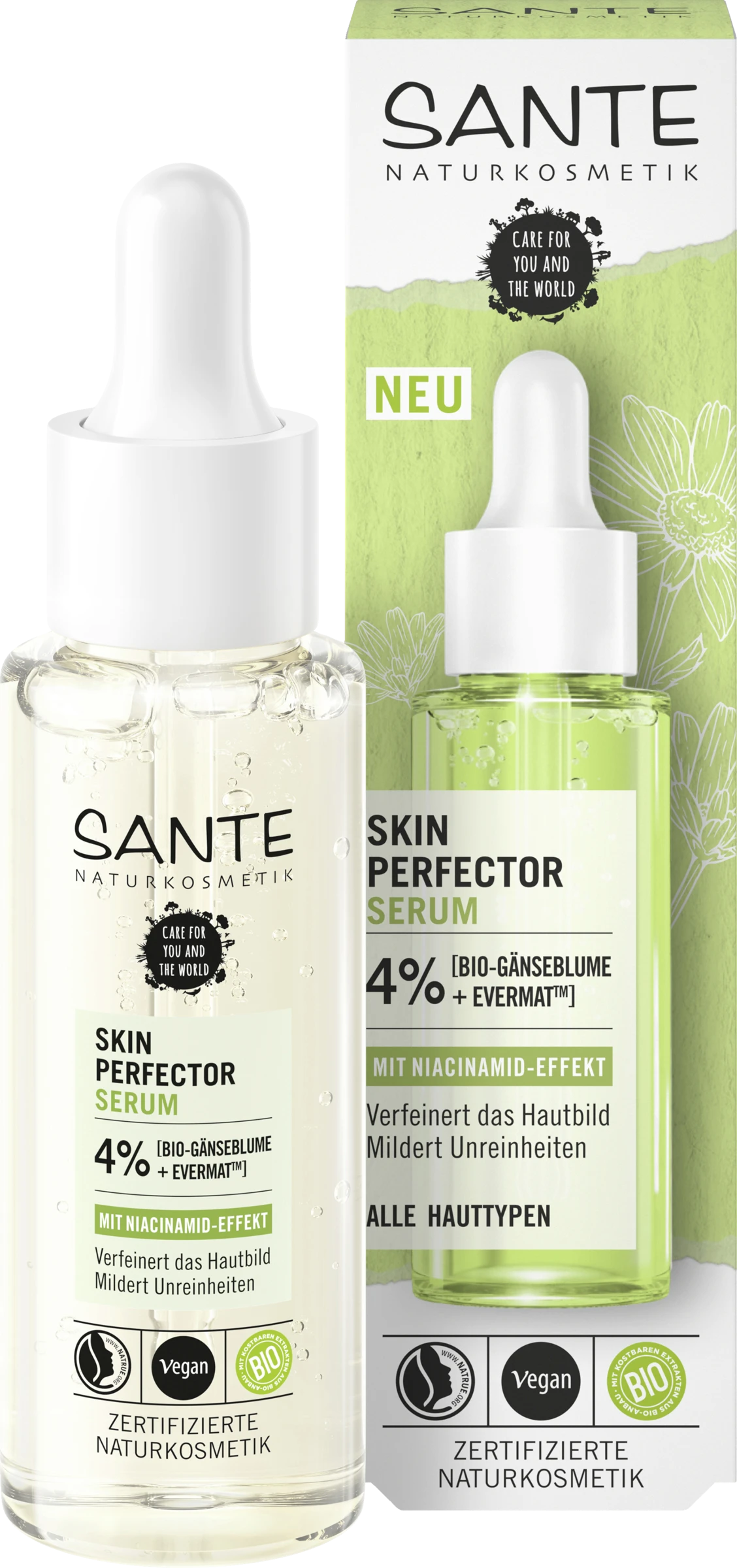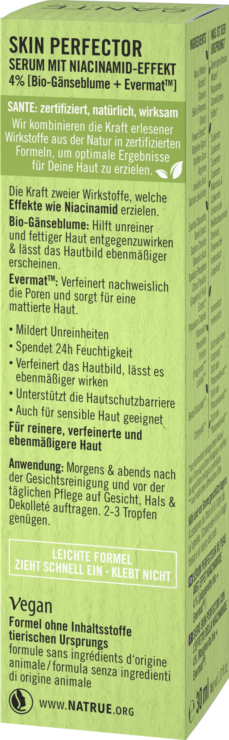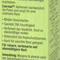 Mildert vergrößerte Poren & bekämpft Unreinheiten. Reguliert Talgproduktion & mattiert. Verfeinert das Hautbild & lässt es ebenmäßiger wirken. Stärkt die Hautschutzbarriere. Gute Verträglichkeit, selbst für sensible Haut Für verfeinerte, ebenmäßigere Haut. Bio-Gänseblümchen Extrakt: Sorgt für einen gleichmäßigen Hautton & einen strahlenden Teint. EvermatTM: Patentierter Wirkstoff Komplex, welcher nachweislich die Poren verfeinert & für ein mattiertes Hautbild sorgt.