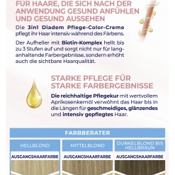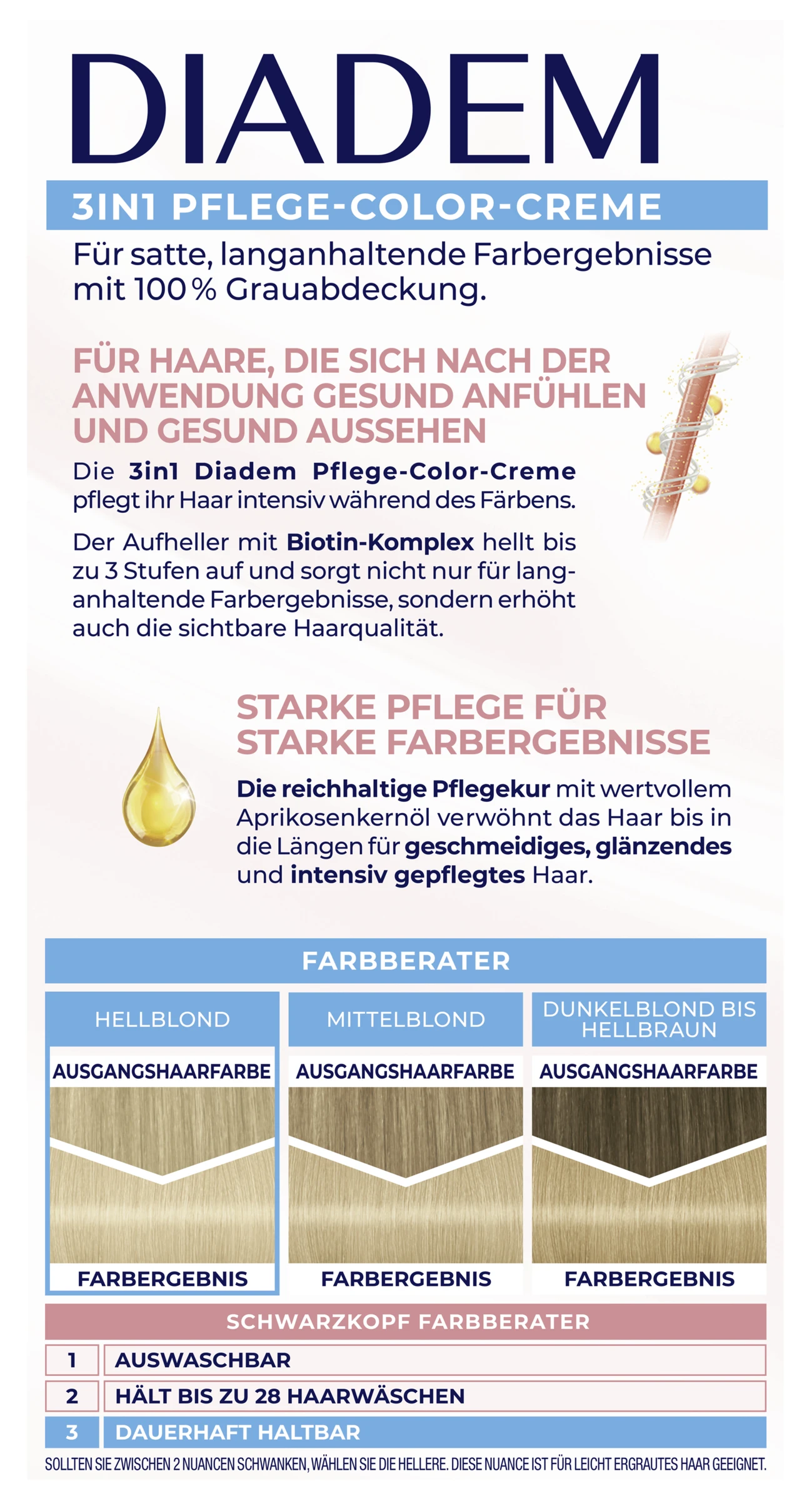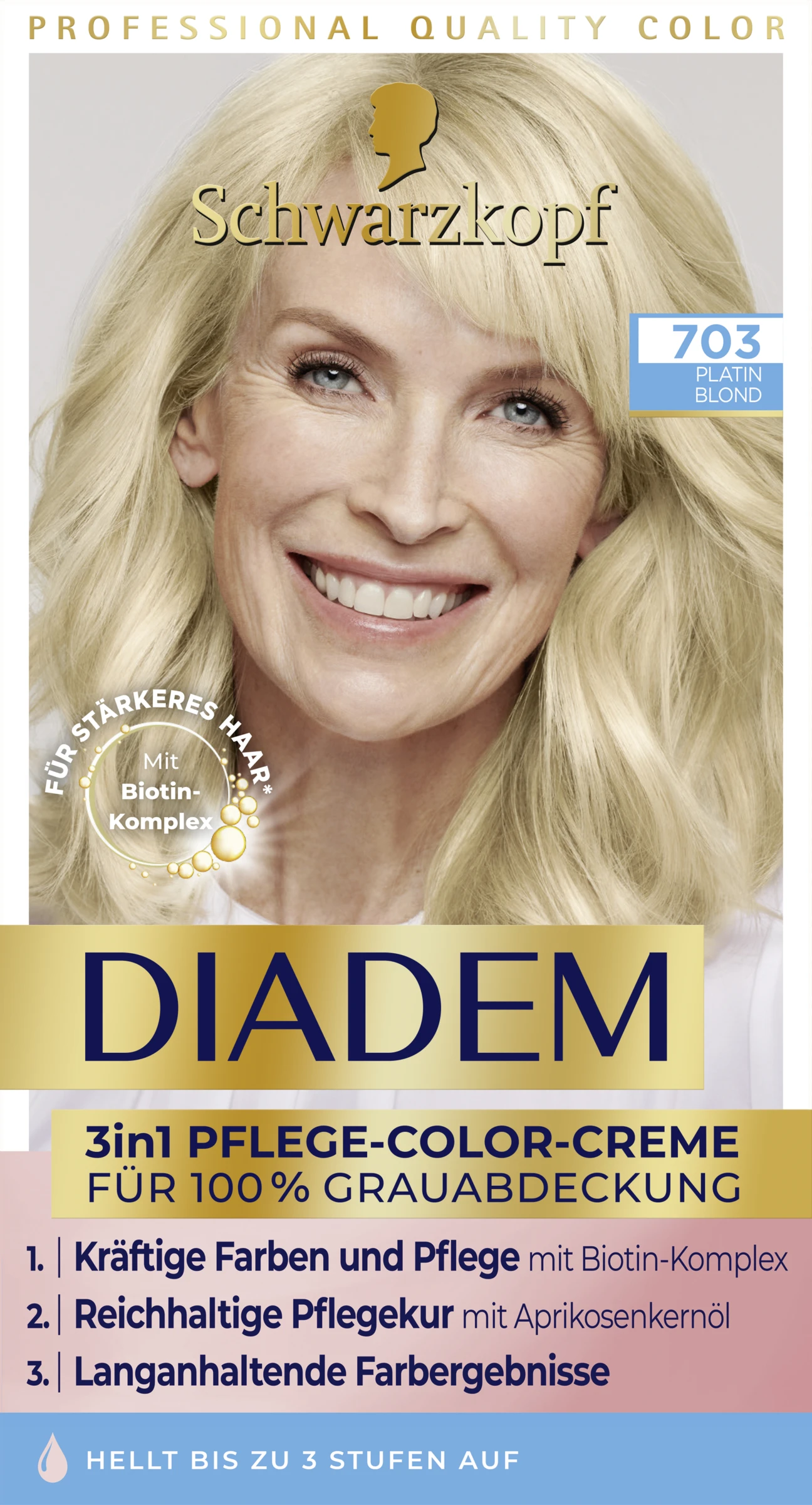 SCHWARZKOPF DIADEM 3 in 1 Pflege-Color-Creme 703 Platin Blond– Für satte, langanhaltende Farbergebnisse. Mit Aprikosenkernöl & Biotin-Komplex. Für Haare, die sich nach der Anwendung gesund anfühlen und gesund aussehen, für 100% Grauabdeckung.