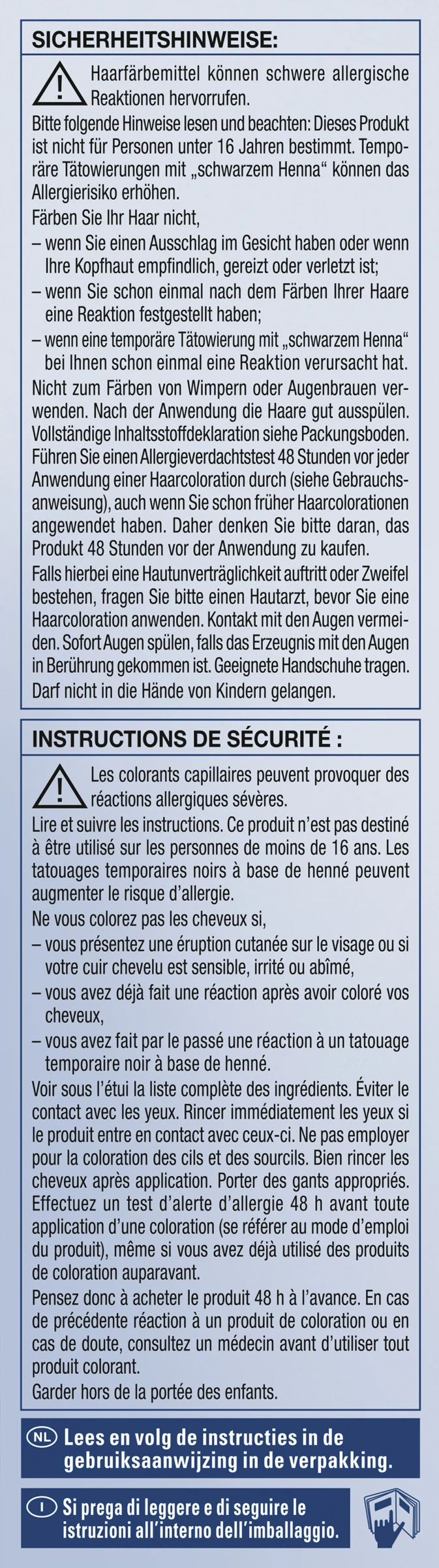 Haarfärbemittel können schwere allergische Reaktionen hervorrufen. Bitte folgende Hinweise lesen und beachten: Dieses Produkt ist nicht fĂĽr Personen unter 16 Jahren bestimmt. Temporäre Tätowierungen mit “schwarzem Henna” können das Allergierisiko erhöhen.