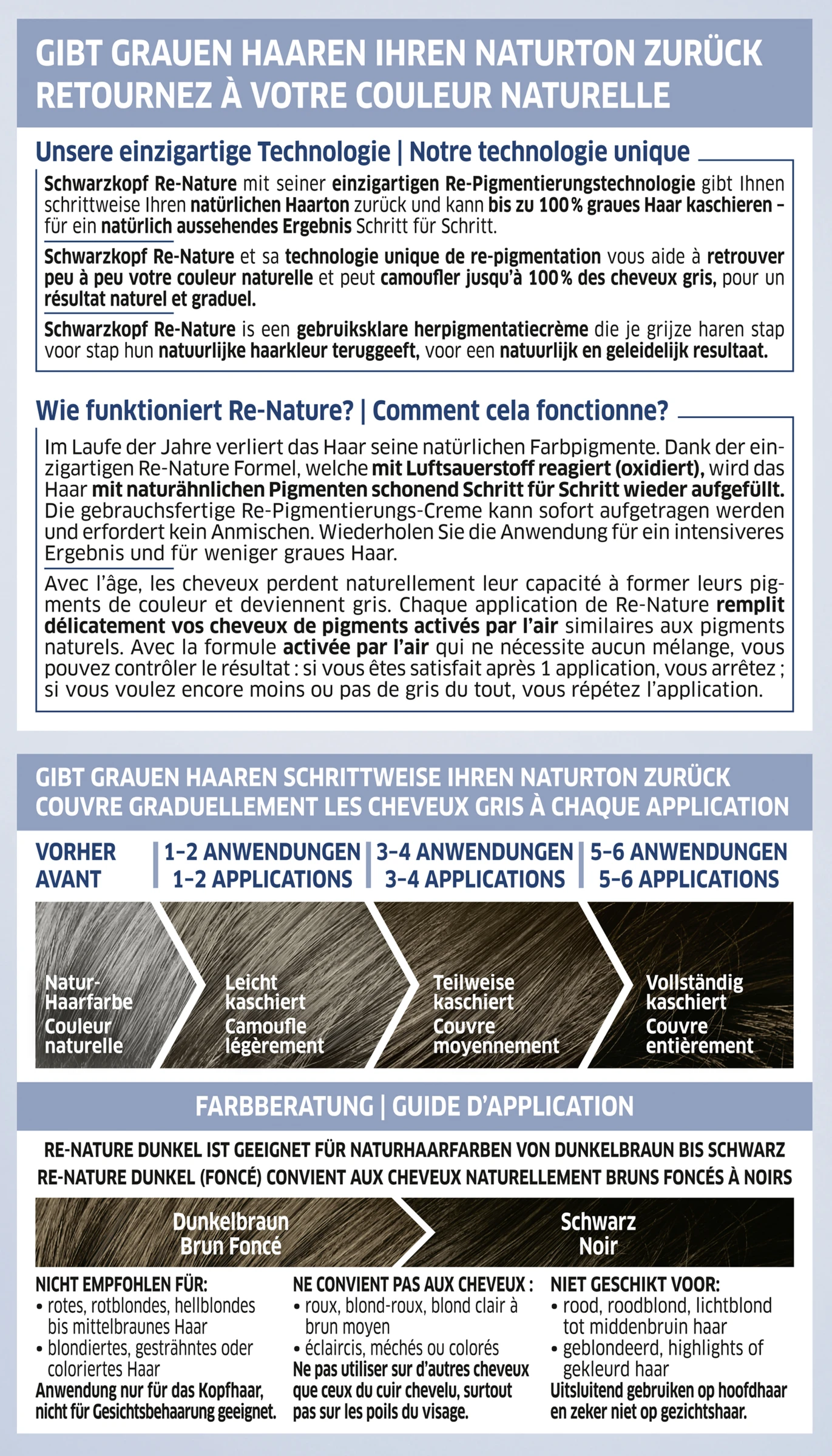 Ihre Haare werden immer grauer, aber eine Coloration kommt für Sie nicht in Frage? Re-Nature ist keine Coloration, sondern eine sanfte Re-Pigmentierungs-Creme und für alle mittelblonden bis schwarzen Naturhaartöne geeignet.