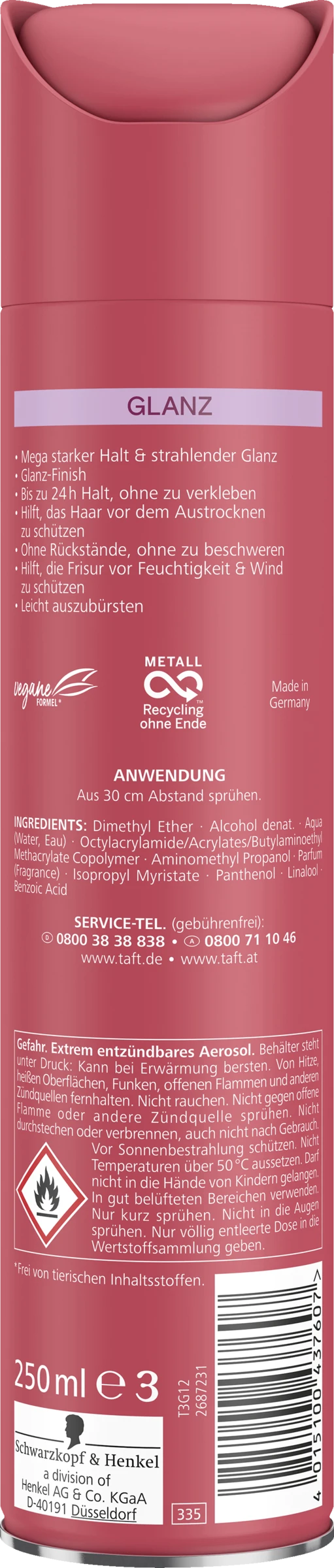 Der Taft Glanz Haarlack für strahlenden Glanz. Die innovative Taft-Glanz-Formel verleiht Ihrem Stil ein glänzendes Lack-Finish. Für bis zu 24 Stunden langanhaltenden Halt, ohne zu verkleben oder Rückstände zu hinterlassen, gleichzeitig lässt sich der Haarlack leicht ausbürsten. Dieser Haarlack hilft, Ihr Haar vor dem Austrocknen zu schützen, ohne es zu beschweren. Er verleiht Ihrem Styling mega-starken Halt, selbst bei Feuchtigkeit und Wind. Taft Haarlacke verwenden vegane Formeln und sind frei von tierischen Inhaltsstoffen.