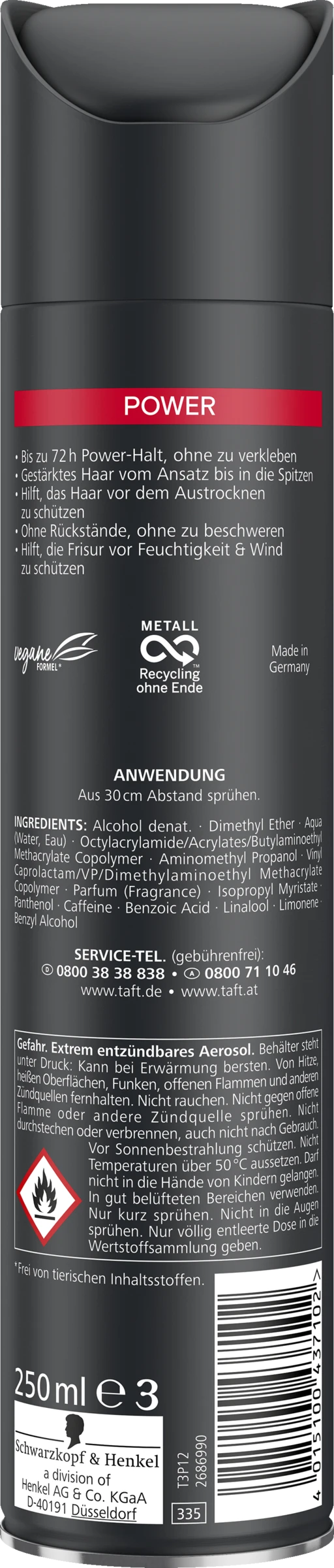 Der Taft Power Haarlack stärkt Ihr Haar vom Ansatz bis in die Spitzen. Die innovative Formel bietet bis zu 72 Stunden Halt, ohne Rückstände zu hinterlassen. Dieser Haarlack hilft, Ihr Haar vor dem Austrocknen zu schützen, ohne es zu beschweren. Er gibt Ihrem Styling auch bei Feuchtigkeit und Wind Power-Halt. Taft Haarlacke verwenden vegane Formeln und sind frei von tierischen Inhaltsstoffen.