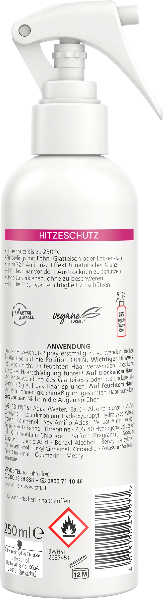 Das Taft Hitzeschutz-Spray bietet einen Hitzeschutzeffekt für Temperaturen bis zu 230°C. Es ist besonders geeignet für Styles, die mit einem Föhn, Glätteisen oder Lockenstab geschaffen werden. Für bis zu 72h Anti-Frizz-Effekt mit einem natürlich aussehenden Glanz, ohne zu verkleben oder das Haar zu beschweren. Ihr Haar wird sowohl vor Föhnschäden als auch vor Feuchtigkeit und Wind geschützt. Taft Hitzeschutz-Sprays verwenden vegane Formeln und sind frei von tierischen Inhaltsstoffen.