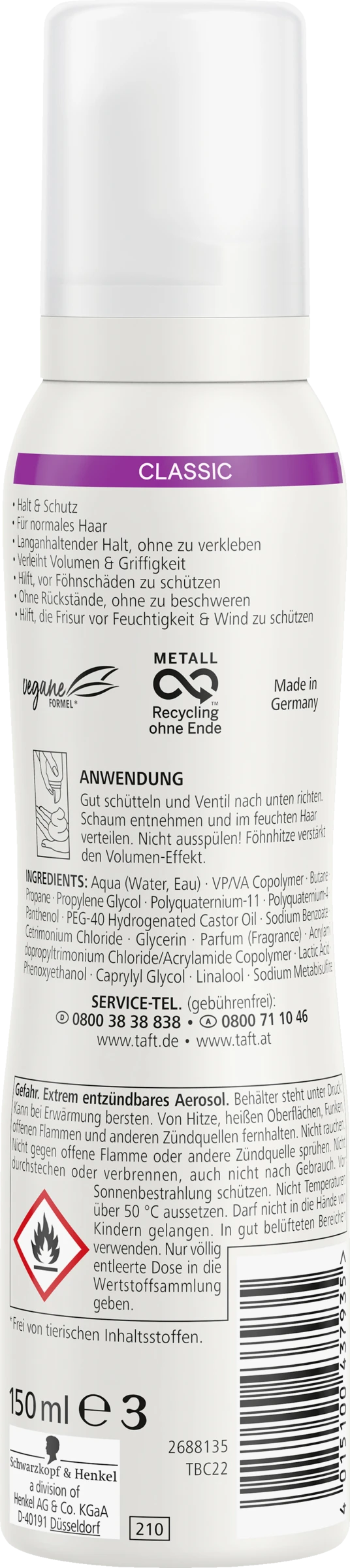 Der Taft Classic Schaumfestiger für Halt & Schutz bietet langanhaltenden Halt, ohne zu verkleben oder Rückstände zu hinterlassen und schützt Ihr Haar. Der Schaumfestiger bietet Volumen und Halt, ohne Ihr Haar zu beschweren. Ihr Haar wird sowohl vor Föhnschäden als auch vor Feuchtigkeit und Wind geschützt. Taft Schaumfestiger verwenden vegane Formeln und sind frei von tierischen Inhaltsstoffen.