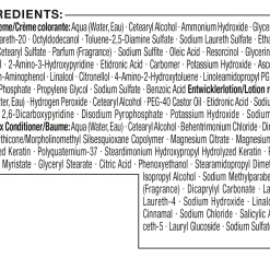 Color-Creme/Creme colorante:Aqua (Water, Eau) . Cetearyl Alcohol, Ammonium Hydroxide . Glyceryl Stearate SE, Ceteareth-20 . Octyldodecanol . Toluene-2,5-Diamine Sulfate, Sodium Laureth Sulfate, Ethanolamine Sodium Cetearyl Sulfate, Pal-1(.1m (Fragrance) . Sodium Sulfite, Oleic Acid, Resorcinol . Glycerin . 2-Vethyl resorcinol, 2-Amino-3-Hydroxypyridine, Etidronic Acid . Carbomer . Potassium Hydroxide . Ascorbic Acid Serine . m-Aminophenol . Linalool . Citronellol . 4-Amino-2-Hydroxytoluene . Linoleamidopropyl PG-Dimonium Chloride Phosphate, Propylene Glycol, Sodium Sulfate, Benzoic Acid