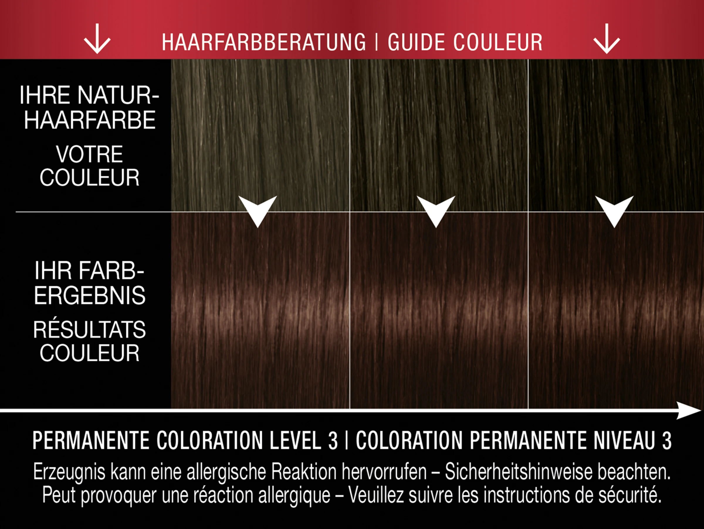 Wir empfehlen diese Nuance fĂĽr mittelbraunes bis schwarzbraunes Haar. FĂĽr leicht bis mittel stark ergrautes Haar geeignet. Dauerhaft haltbar. Detaillierte Anwendungshinweise in der Packungsbeilage beachten.