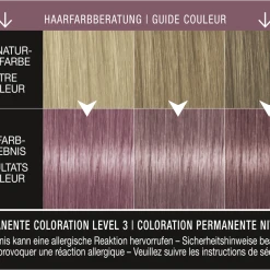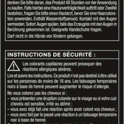Haarfärbemittel können schwere allergische Reaktionen hervorrufen. Bitte folgende Hinweise lesen und beachten: Dieses Produkt ist nicht für Personen unter 16 Jahren bestimmt. Temporäre Tätowierungen mit „schwarzem Henna“ können das Allergierisiko erhöhen. Färben Sie Ihr Haar nicht, – wenn Sie einen Ausschlag im Gesicht haben oder wenn Ihre Kopfhaut empfindlich, gereizt oder verletzt ist; – wenn Sie schon einmal nach dem Färben Ihrer Haare eine Reaktion festgestellt haben; – wenn eine temporäre Tätowierung mit „schwarzem Henna“ bei Ihnen schon einmal eine Reaktion verursacht hat. Enthält Wasserstoffperoxid. Nicht zur Färbung von Wimpern und Augenbrauen verwenden. Nach Anwendung die Haare gut spülen. Für eine vollständige Inhaltsstoffdeklaration siehe Packungsboden. Führen Sie einen Allergieverdachtstest 48 Stunden vor jeder Anwendung einer Haarcoloration durch (siehe Gebrauchsanweisung), auch wenn Sie schon früher Haarcolorationen angewendet haben. Daher denken Sie bitte daran, das Produkt 48 Stunden vor der Anwendung zu kaufen. Falls hierbei eine Hautunverträglichkeit auftritt oder Zweifel bestehen, fragen Sie bitte einen Hautarzt, bevor Sie eine Haarcoloration anwenden. Enthält Wasserstoffperoxid. Kontakt mit den Augen vermeiden. Sofort Augen spülen, falls das Erzeugnis mit den Augen in Berührung gekommen ist. Geeignete Handschuhe tragen. Darf nicht in die Hände von Kindern gelangen.