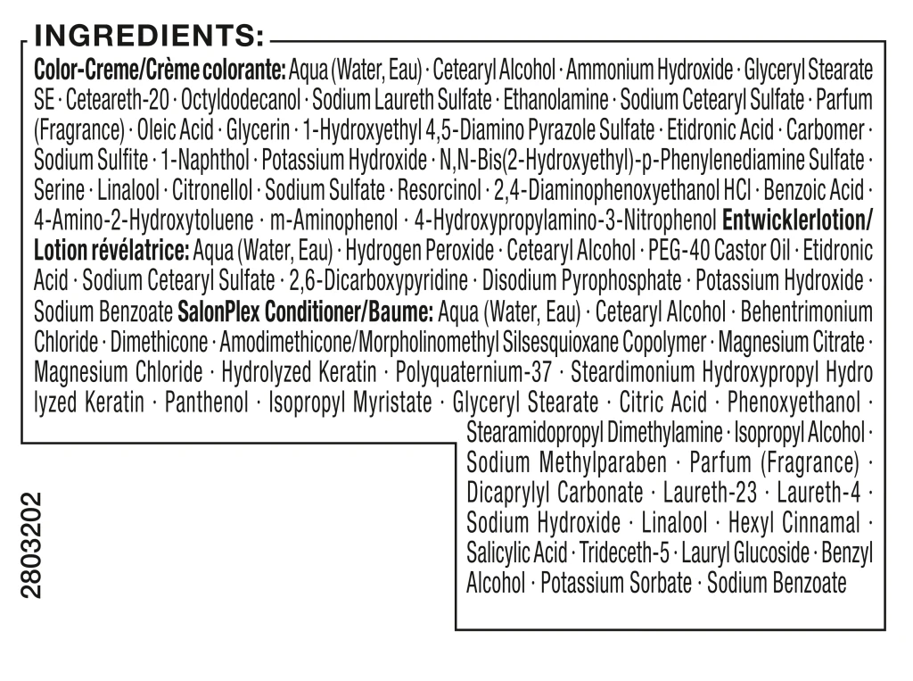 Color-Creme: Aqua (Water, Eau)*Cetearyl Alcohol*Ammonium Hydroxide*Glyceryl Stearate SE*Ceteareth-20*Octyldodecanol*Sodium Laureth Sulfate*Ethanolamine*Sodium Cetearyl Sulfate*Parfum (Fragrance)*Oleic Acid*Glycerin*1-Hydroxyethyl 4,5-Diamino Pyrazole Sulfate*Etidronic Acid*Carbomer*Sodium Sulfite*1-Naphthol*Potassium Hydroxide*N,N-Bis(2-Hydroxyethyl)-p-Phenylenediamine Sulfate*Serine*Linalool*Citronellol*Sodium Sulfate*Resorcinol*2,4-Diaminophenoxyethanol HCl*Benzoic Acid*4-Amino-2-Hydroxytoluene*m-Aminophenol*4-Hydroxypropylamino-3-Nitrophenol