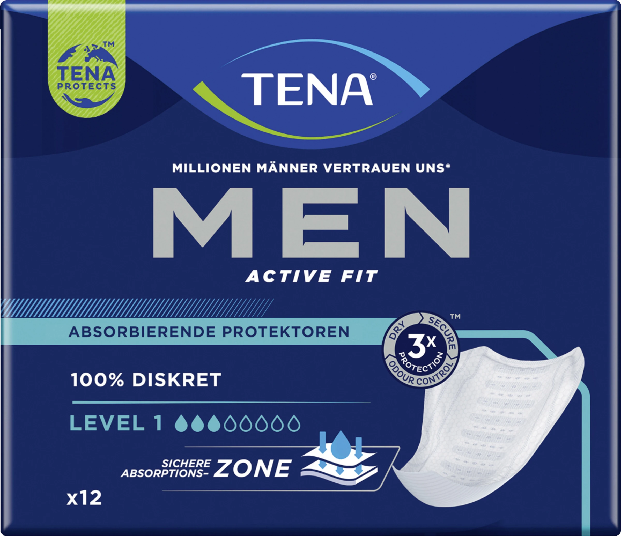 Tena Men Absorbierende Protektoren Einlagen Level 1 mit Absorptions-Kontrolle, schützen bei unfreiwilligem Harnverlust und leichtem Nachtröpfeln für einen aktiven Lebensstil.