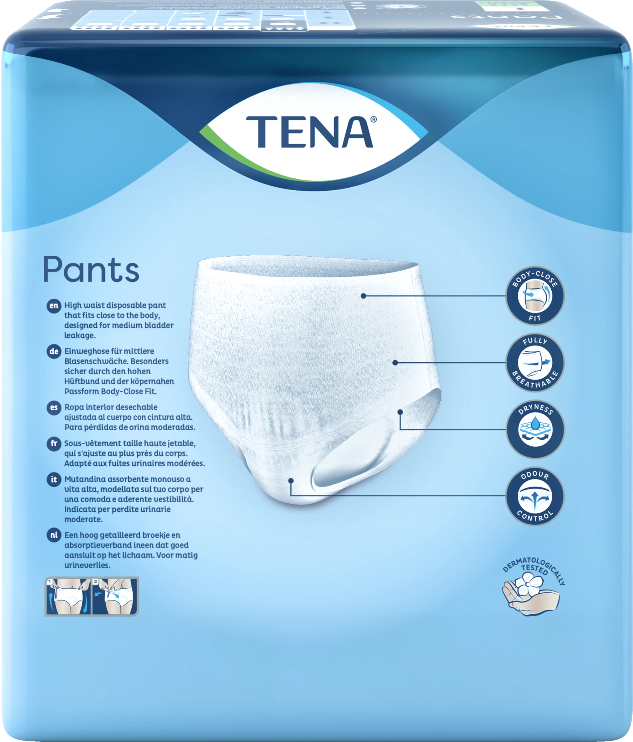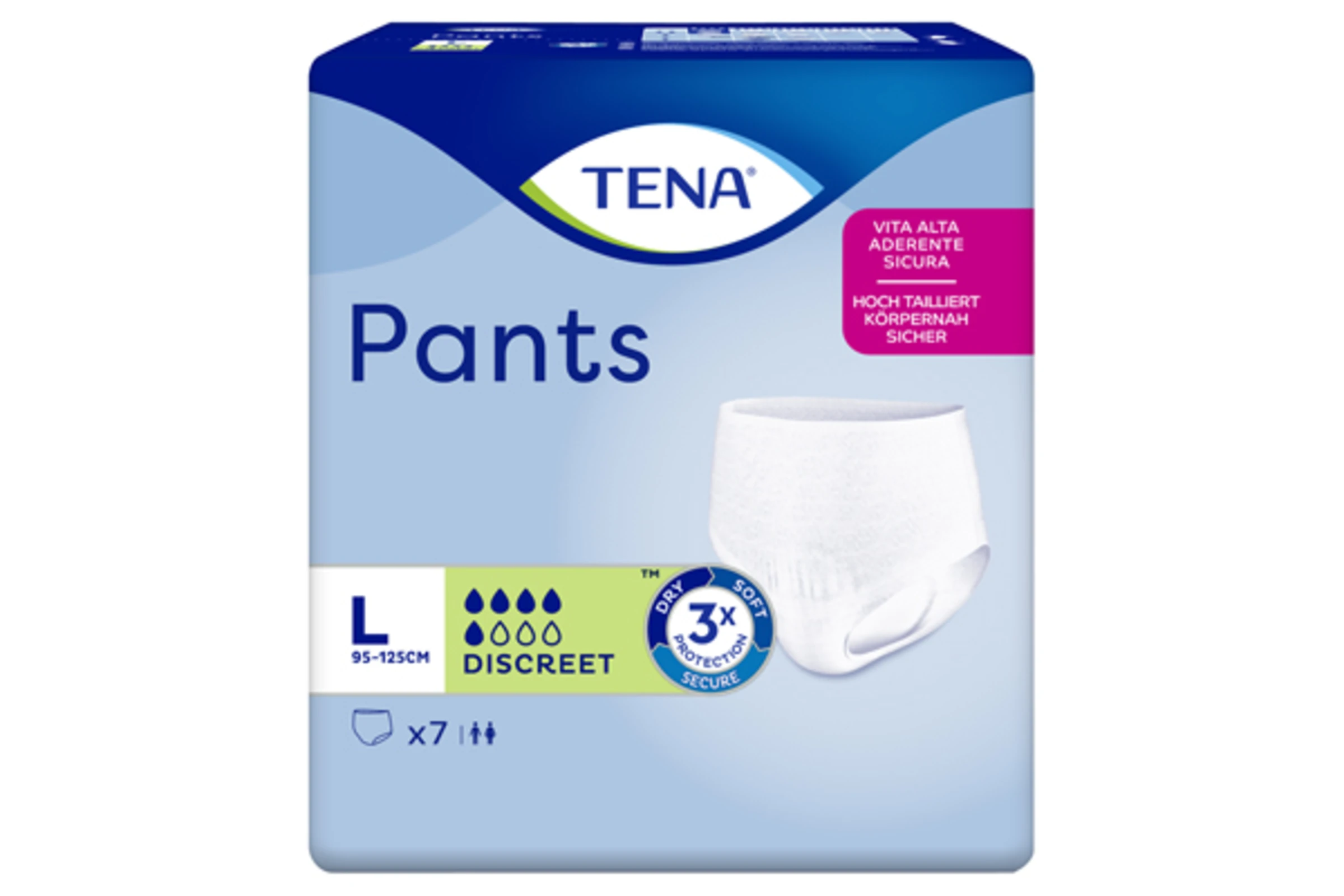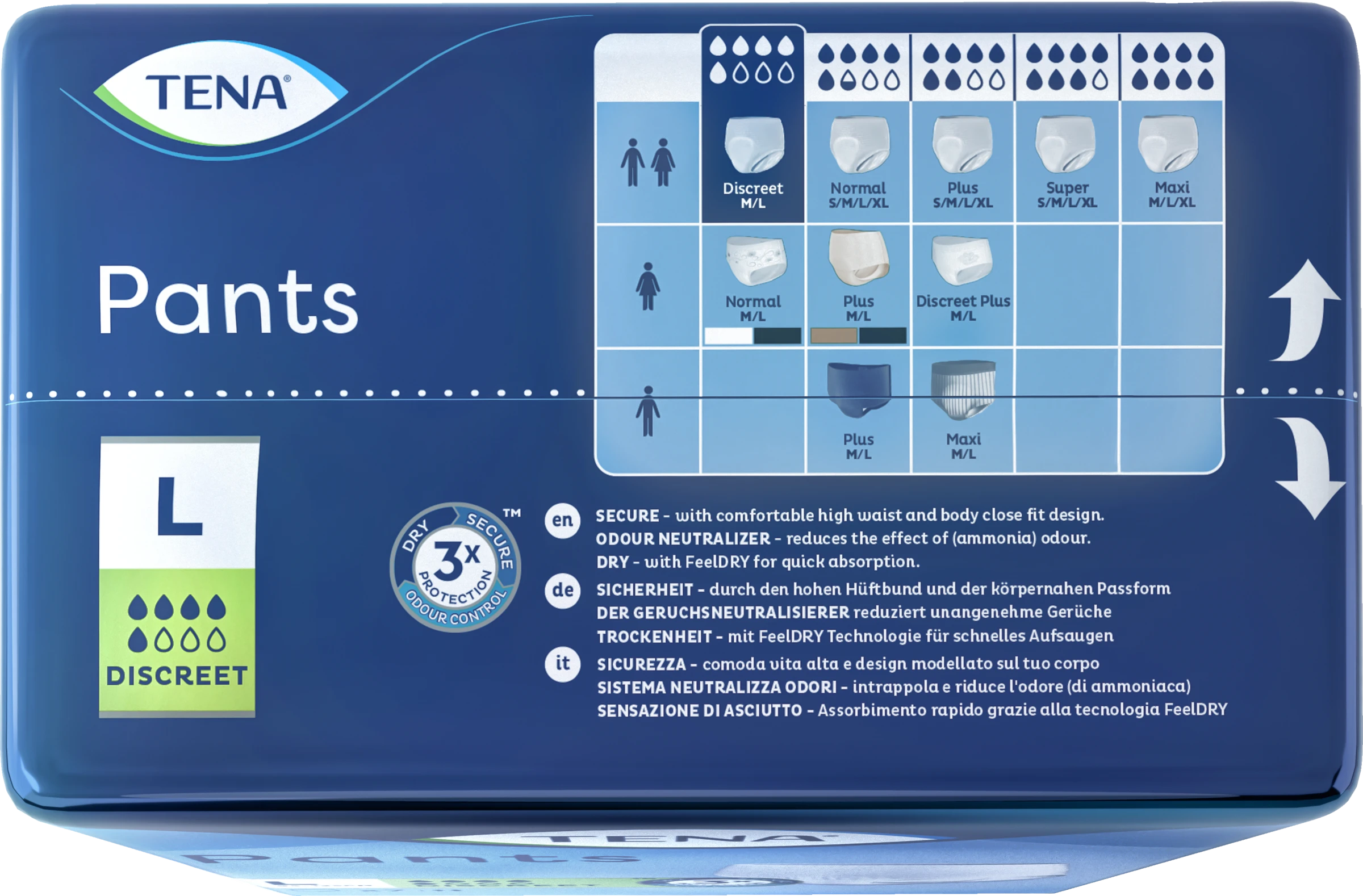 TENA Pants Discreet sind bequeme und weiche Einweghosen mit hohem Bund, die speziell für mittelstarke Blasenschwäche entwickelt wurden. Die hochleistungsfähigen, schützenden Einweghosen verfügen über eine feuchtigkeitsreduzierende Technologie, die Trockenheit und Schutz vor Auslaufen und Geruchsbildung bietet. Ihre elastische Form passt sich der Körperform perfekt an und garantiert einen besonders sicheren und diskreten Sitz, selbst unter enger Kleidung. Die Einweg-Inkontinenzhosen bestehen aus textilähnlichem, atmungsaktivem und außergewöhnlich saugfähigem Material. Ihre Pull-up-Passform sorgt für den guten, unterwäscheähnlichen Sitz und ermöglicht ihren Anwendern einen unabhängigen und aktiven Alltag.